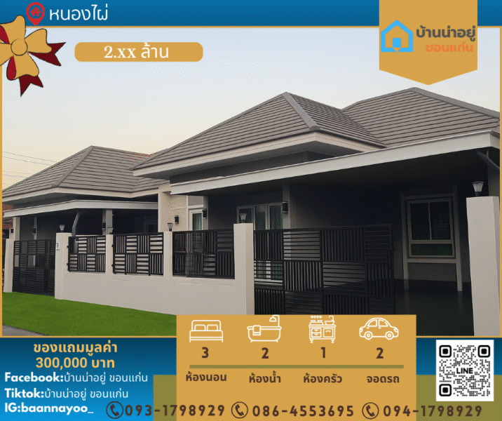 บ้าน ค.ส.ล. 1 ชั้น/ 3 ห้องนอน/ 2 ห้องน้ำ/ 2 ที่จอดรถ /เนื้อที่ 50 ตรว. /